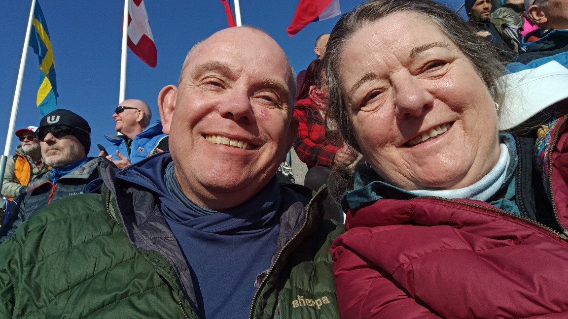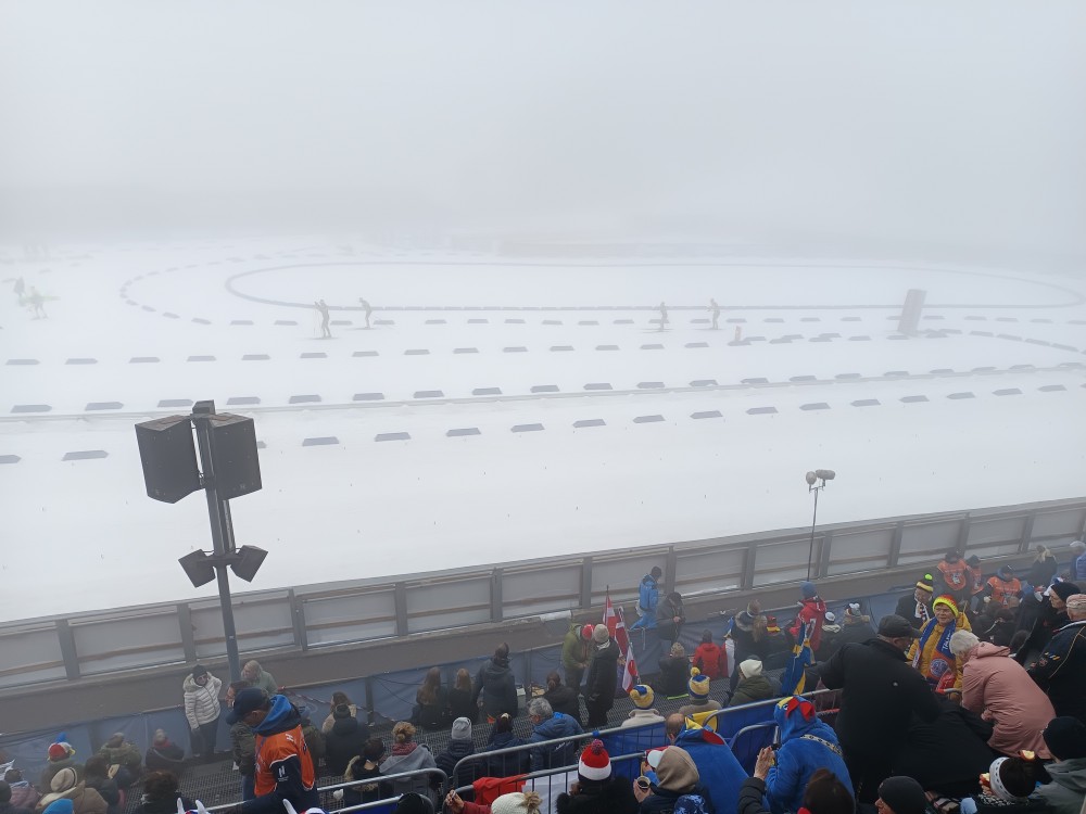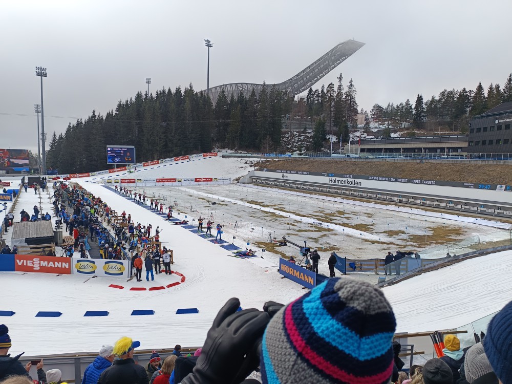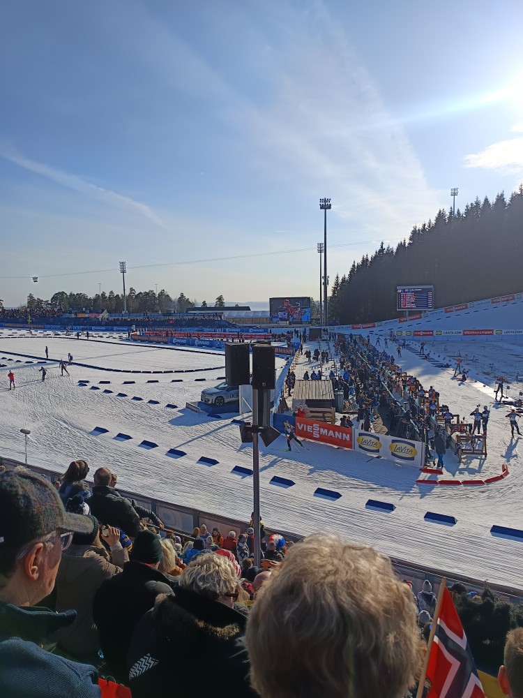 Die Wettervorhersage für diesen Tag war leider schlecht. Bis mittags Nebel und um die 0 Grad. Also alles an Klamotten angezogen, was der Rucksack so hergab. Mit der Metro ging es in 20 Minuten aus dem Stadtzentrum zum Holmenkollen, dann 15 Minuten zu Fuß zum Wettkampfgelände. Drei Stunden vor Wettkampfbeginn schon die reinste Völkerwanderung. Und wo ist der beste Platz? Wir entschieden uns für einen Platz mit Blick auf den Schießstand, von dort hat man auch Blick auf eine große Leinwand. Naja, erstmal nicht, denn es war total neblig. Zum Glück kam zum Einschießen dann langsam die Sonne raus. Das war auch nötig, denn fast drei Stunden bei etwa null Grad waren schon ambitioniert. Zum Glück hatten wir Thermositzkissen dabei, aber eine Fleecedecke wäre super gewesen. Mit der Sonne war es dann super warm und beide Verfolgungsrennen waren total spannend. Bei den Männern entschied dann sogar das Zielfoto über Platz eins und zwei. Die After Ski Party im Zelt ließen wir sausen, wir wollten uns lieber in einem Restaurant auftauen. Auf dem Weg zur Metro kamen wir auch direkt an der Schanze vorbei, bei der Ankunft morgens war sie im dichten Nebel nicht zu sehen.