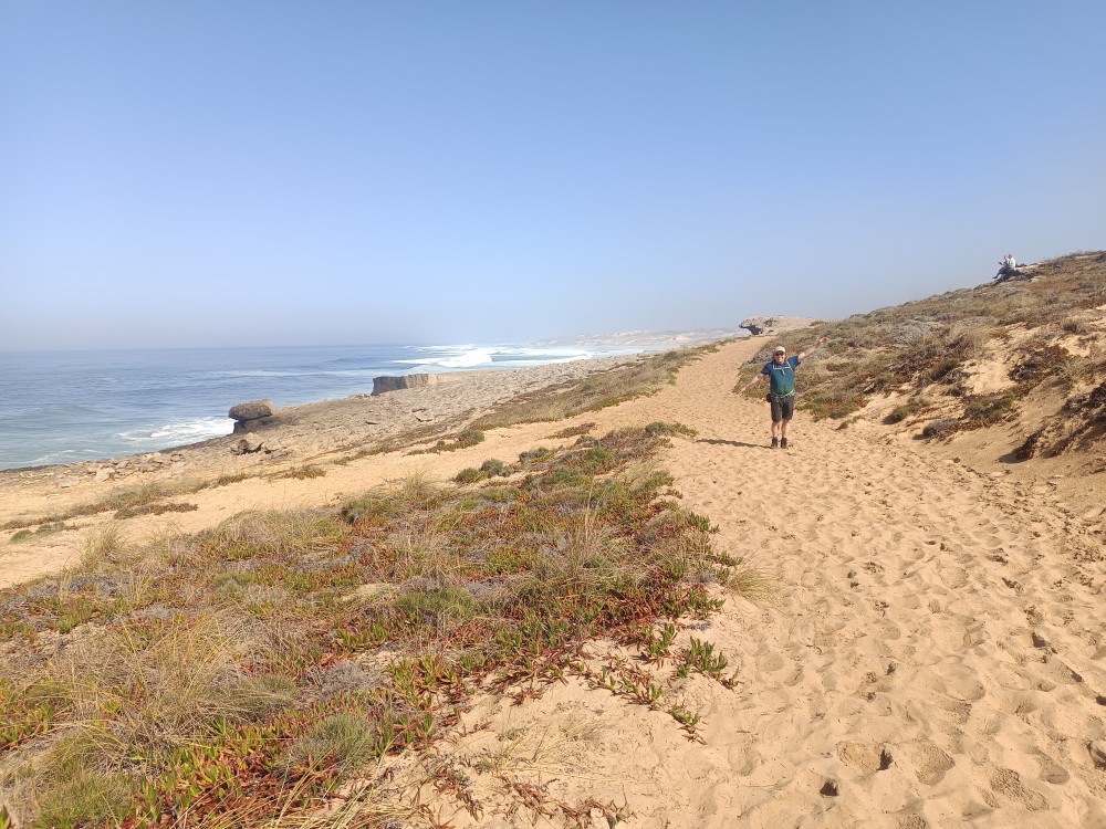 Die erste Etappe des Fischerwegs ist geschafft. Um 7 Uhr sind wir in Porto Covo gestartet und nach knapp drei Kilometern standen wir vor der ersten Herausforderung. Eine eingestürzte Brücke. Und da wir auf den Kilometern davor schon ziemlich komplizierte Schlammumrundungen und Pfützenüberquerungen gemeistert hatten, war Umdrehen keine Option. Wir meisterten es dann wie ein Team aus Indiana Jones und Lara Croft – zum Glück hatten wir keine Zuschauer. Kurze Zeit später standen wir vor einer Flussüberquerung, zogen Schuhe und Socken aus und waren auf der anderen Seite. Barfuß ging’s dann bis zum nächsten Holzsteg und wir nutzten die Trockenphase für eine Kaffeepause. Der restliche Weg war nicht mehr so schwierig, ab Kilometer acht aber im tiefen Sand. Ganz schön anstrengend. Nach 17,8 Kilometern und sieben Stunden Laufzeit erreichten wir dann unser Zwischenziel. Ein Restaurant an der Küste. Hungrig genug waren wir jetzt, da hatten wir schon keine Zeit mehr für ein Essensfoto. Jetzt geht’s noch 2,7 Kilometer bis zur Unterkunft, das schaffen die Füße jetzt auch noch.