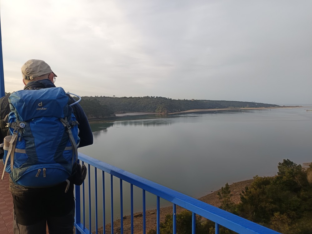 Die erste Etappe des Fischerwegs ist geschafft. Um 7 Uhr sind wir in Porto Covo gestartet und nach knapp drei Kilometern standen wir vor der ersten Herausforderung. Eine eingestürzte Brücke. Und da wir auf den Kilometern davor schon ziemlich komplizierte Schlammumrundungen und Pfützenüberquerungen gemeistert hatten, war Umdrehen keine Option. Wir meisterten es dann wie ein Team aus Indiana Jones und Lara Croft – zum Glück hatten wir keine Zuschauer. Kurze Zeit später standen wir vor einer Flussüberquerung, zogen Schuhe und Socken aus und waren auf der anderen Seite. Barfuß ging’s dann bis zum nächsten Holzsteg und wir nutzten die Trockenphase für eine Kaffeepause. Der restliche Weg war nicht mehr so schwierig, ab Kilometer acht aber im tiefen Sand. Ganz schön anstrengend. Nach 17,8 Kilometern und sieben Stunden Laufzeit erreichten wir dann unser Zwischenziel. Ein Restaurant an der Küste. Hungrig genug waren wir jetzt, da hatten wir schon keine Zeit mehr für ein Essensfoto. Jetzt geht’s noch 2,7 Kilometer bis zur Unterkunft, das schaffen die Füße jetzt auch noch.